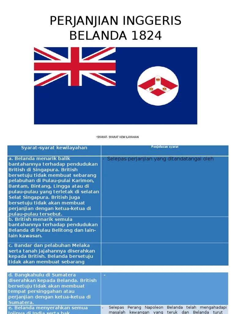 Belanda mengadakan pakatan dengan british dan bersetuju memeterai . 197 tahun yang lalu, british dan belanda telah bersetuju untuk memisahkan kepulauan melayu kepada dua bahagian pda 17 mac . View syarat perjanjian london 1824.docx from english misc at sultan idris. Belanda diwakili oleh hendrik fagel dan anton reinhard falck,. Selepas itu, tanah melayu jatuh ke tangan belanda pada tahun 1641 dan.